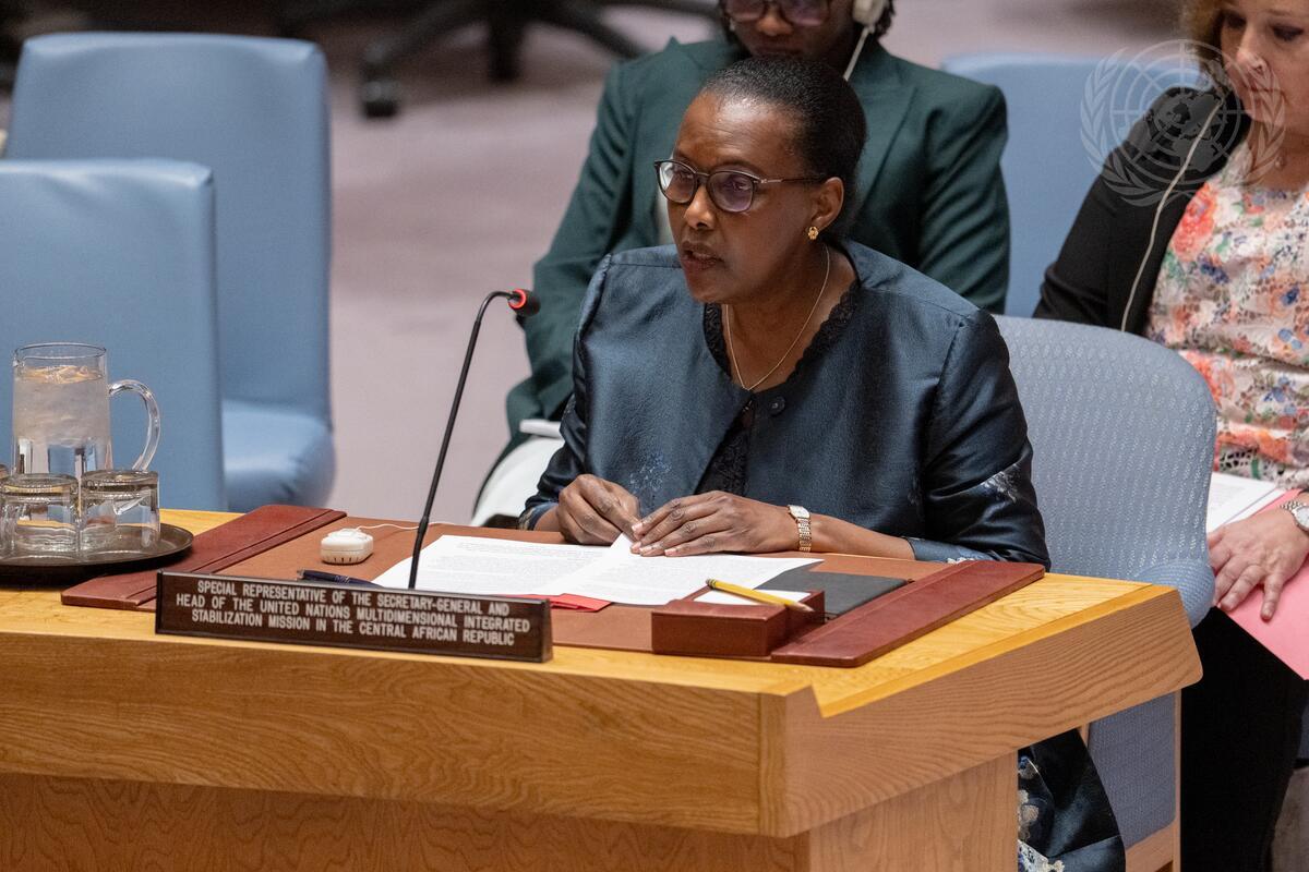 Valentine Rugwabiza, Special Representative of the Secretary-General for the Central African Republic and Head of the United Nations Multidimensional Integrated Stabilization Mission in the Central African Republic (MINUSCA), briefs the Security Council meeting the situation in the Central African Republic.