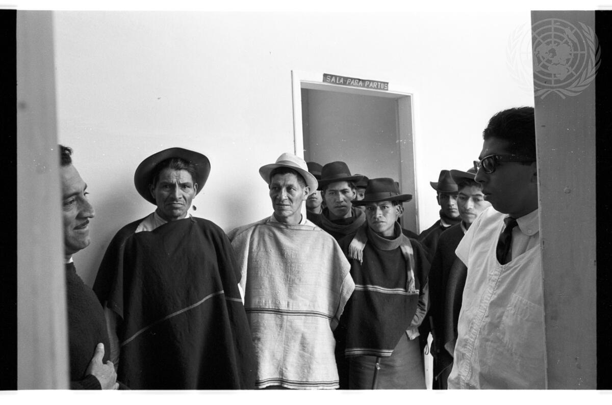 Chief ILO adviser Dr. Gonzalo Pesantez (Ecuador) accompanies (far left) officials from the Guambia Township Community Council on their visit to the health centre in Silvia, where Indians receive free medical care. [May 1966]